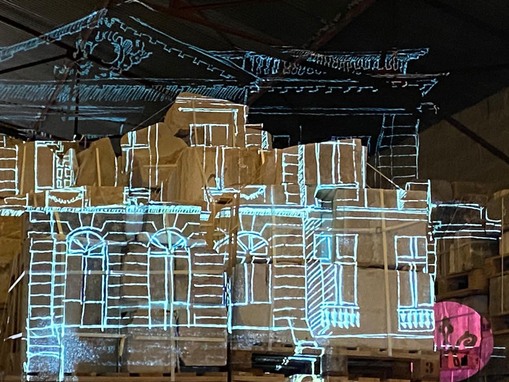 Preparing the site to present the Chateau, with projection of images on the pallets.